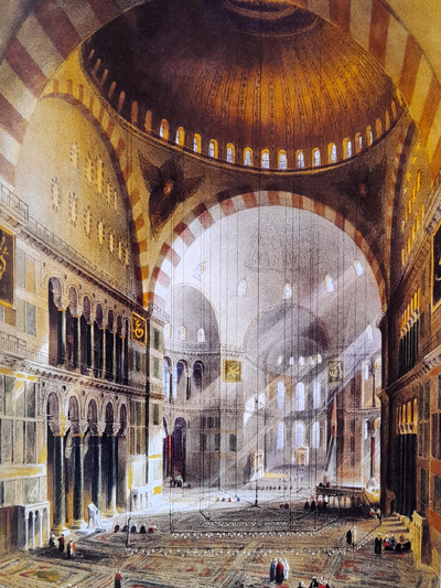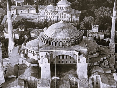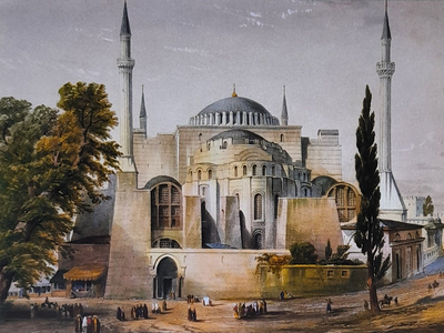 Η Μεγάλη Εκκλησία, η Αγία Σοφία, μετατρέπεται σε τζαμί. Θηριώδη ταμπλό με προσευχές από το κοράνι αναρτώνται εσωτερικά στις τέσσερις γωνίες της, κάτω από τα σφαιρικά τρίγωνα, που απορροφούν το βάρος του τρούλου. Η πρόσβαση στον ναό είναι ελεύθερη μόνον για τους Οθωμανούς, που εισέρχονται ανυπόδητοι για να υμνήσουν τον Αλλάχ. Το κάλεσμα σε προσευχή από τον μιναρέ, που προστίθεται στο νοτιοδυτικό εξωτερικό άκρο του ναού, αντηχεί σε όλη την πόλη. Τον 16ο αι. ο Οθωμανός αρχιτέκτονας Σινάν αντικαθιστά αυτόν τον αρχικό μιναρέ με νέο και προσθέτει άλλους τρεις στα υπόλοιπα άκρα του κτηρίου.