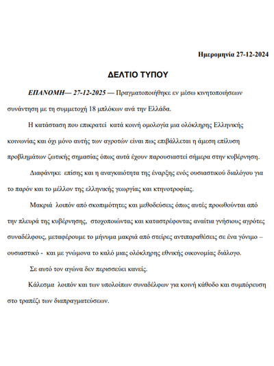 Παράλληλα, τονίζεται η αναγκαιότητα έναρξης ενός ουσιαστικού και γόνιμου διαλόγου με τους συμμετέχοντες να δηλώνουν ότι απορρίπτουν «σκοπιμότητες και μεθοδεύσεις» που, όπως αναφέρουν, προωθούνται από την πλευρά της κυβέρνησης. Στην ανακοίνωση γίνεται λόγος για στοχοποίηση και «αναίτια καταστροφή γνήσιων αγροτών συναδέλφων», ενώ διατυπώνεται η θέση ότι ο διάλογος πρέπει να διεξαχθεί μακριά από στείρες αντιπαραθέσεις και με γνώμονα το συμφέρον της εθνικής οικονομίας.
