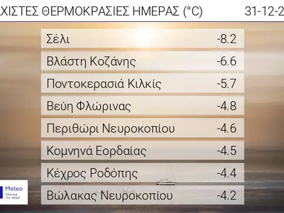 Σύμφωνα με το δίκτυο αυτόματων μετεωρολογικών σταθμών του Εθνικού Αστεροσκοπείου Αθηνών / meteo.gr οι οκτώ χαμηλότερες ελάχιστες θερμοκρασίες κατά τις πρωινές ώρες της Τετάρτης 31/12, παρουσιάζονται στον παρακάτω πίνακα.