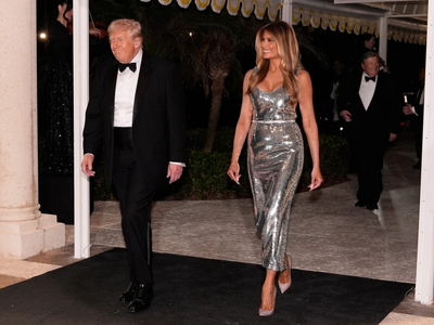 Φορώντας μαύρο σμόκιν, ο Ντόναλντ Τραμπ μίλησε για λίγο σε δημοσιογράφους έξω από την αίθουσα εκδηλώσεων του Mar-a-Lago, με τη Μελάνια Τραμπ να στέκεται στο πλευρό του, φορώντας ένα εντυπωσιακό ασημί φόρεμα.