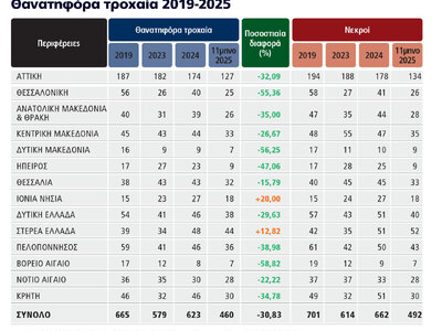 Οι αριθμοί επιβεβαιώνουν τη θετική τάση, τους έντεκα μήνες του 2025 οι νεκροί σε τροχαία δυστυχήματα μειώθηκαν κατά σχεδόν 31% σε σύγκριση με το 2019, από 701 σε 492. Παρά τη μείωση, ο φόρος αίματος παραμένει βαρύς, με κατά μέσο όρο 45 ανθρώπους να χάνουν τη ζωή τους κάθε μήνα στην άσφαλτο.