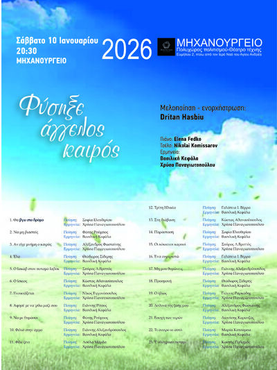 "Φύσηξε άγγελος καιρός". Έτσι τιτλοφορείται η ξεχωριστή, όπως αναμένεται, μουσική βραδιά γεμάτη στίχους και μελωδίες, όπου η ποίηση συναντά το τραγούδι. Η μουσική βραδιά διοργανώνεται στον Πολυχώρο Μηχανουργείο (Θέατρο Τέχνης & Πολιτισμού στην οδό Ευμήλου 2-4, πίσω από τον Ιερό ναό του Αγίου Ανδρέα στην Πάτρα) αυτό το Σάββατο 10/1/2026 και ώρα 20:30 μ.μ.
