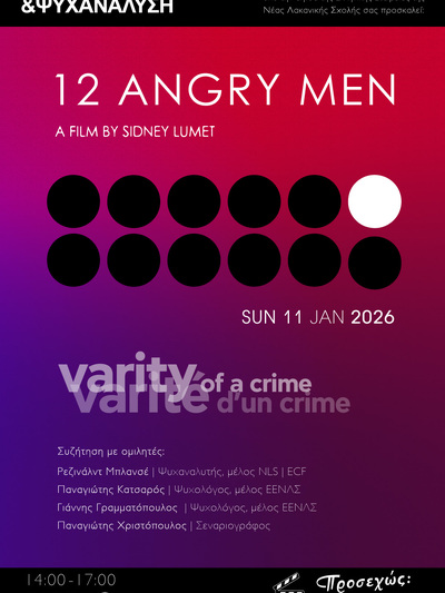 Το Σινεμά & Ψυχανάλυση υπό την αιγίδα της Ελληνικής Εταιρείας της Νέας Λακανικής Σχολής και με την υποστήριξη της Ακαδημίας Κλινικών Σπουδών της Αθήνας διοργανώνει την προβολή της εξαιρετικής ταινίας “Οι Δώδεκα Ένορκοι” του Σίντνεϊ Λουμέτ, την Κυριακή 11 Ιανουαρίου 2026 στις 14:00 στον κινηματογράφο Δαναό.