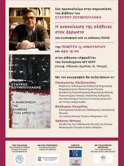 Η εκδήλωση παρουσίασης του βιβλίου του Σταύρου Ζοτμπουλάκη τελεί υπό την αιγίδα της Ιατρικής Εταιρείας Δυτικής Ελλάδος- Πελοποννήσου.