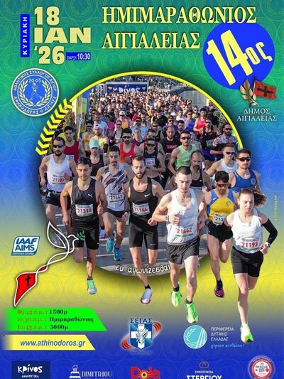 Την Κυριακή 18 Ιανουαρίου 2026 θα διεξαχθεί ο 14ος Ημιμαραθώνιος Αιγιαλείας, καθώς και οι παράλληλοι αγώνες δρόμου 5 χλμ. και 1,5 χλμ., από τις 09:30 έως τις 13:30, με αφετηρία, τερματισμό και απονομές στον χώρο πλησίον του παλαιού λιμανιού του Αιγίου (Δώδεκα Βρύσες).