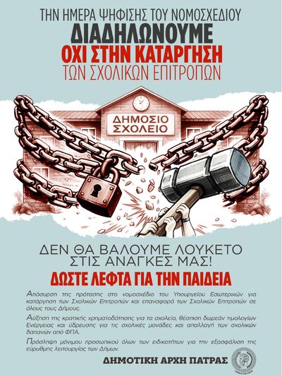 Η πολιτική επιλογή, όλων των μέχρι σήμερα κυβερνήσεων, που έχουν στο στόχαστρο τη Δημόσια Παιδεία, μεγαλώνουν τους ταξικούς φραγμούς στην εκπαίδευση, δημιουργώντας ουσιαστικά σχολεία πολλών «ταχυτήτων», διαφοροποιώντας ακόμη και το περιεχόμενο της εκπαίδευσης. Η κατάργηση των Σχολικών Επιτροπών αποτελεί έναν ακόμα κρίκο στην αλυσίδα που έχει στόχο να βάλει λουκέτο στα δικαιώματα και τις ανάγκες των παιδιών μας.