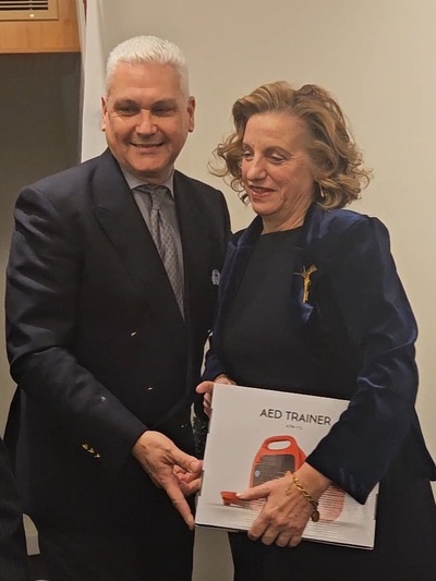 Τον εκπαιδευτικό απινιδωτή προσέφερε ο κ. Ζαΐμης μαζί με τον Αντιπεριφερειάρχη Τουριστικής Ανάπτυξης Παναγιώτη Σακελλαρόπουλο και την Αντιπεριφερειάρχη Δημόσιας Υγείας Άννα Μαστοράκου.