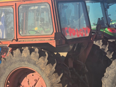Οι δράστες έγραψαν με μπλε και κόκκινη μπογιά τη λέξη «προδότης» ενώ έσκασαν και τα λάστιχα των τρακτέρ