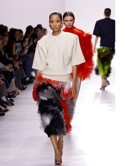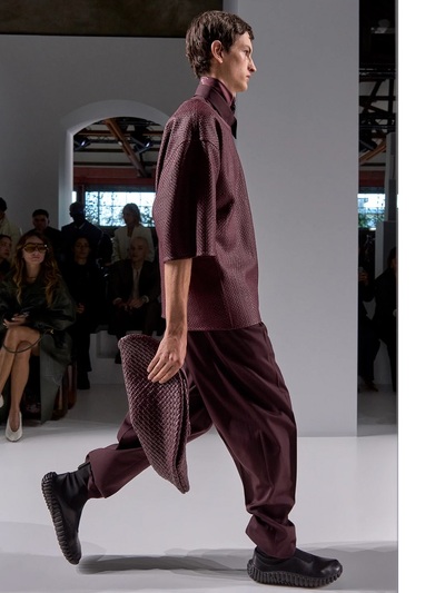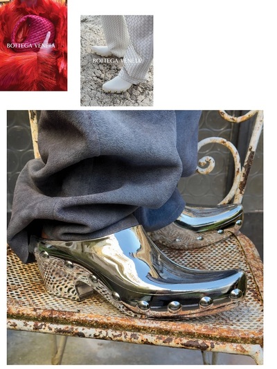 Εν όψει άνοιξης, η Bottega Veneta εστιάζει στην τρισδιάστατη κίνηση μέσα από τα πρωτοποριακά κρόσσια του λαμπερού tinsel. Πρόκειται για μια νέα πρόταση που μπαίνει δίπλα στα παραδοσιακά φτερά και στο περίφημο πλεκτό δέρμα intreccciato. Λιτά πλεκτά και υψηλό tailoring συνδυάζονται με αυτό το αστραφτερό εφέ τριχωτής γιρλάντας που έγινε σήμα κατατεθέν σε πανοφόρια, φούστες και όχι μόνο. Tα new vintage γυαλιά, τα άβαφα πρόσωπα, τα εκκεντρικά σχήματα σε γοβάκια και σαμπό, το γκρι σουέντ, τα ανδρόγυνα πουκάμισα κυριαρχούν επίσης στα looks.