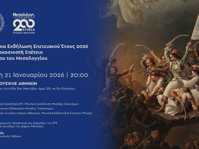 Η ΕΡΤ έδωσε στη δημοσιότητα το τηλεοπτικό spot για την Εναρκτήρια Εκδήλωση της Διακοσιοστής (200ής) Επετείου της Εξόδου του Μεσολογγίου (1826) στο Μέγαρο Μουσικής Αθηνών, την Τετάρτη, 21 Ιανουαρίου 2026.
