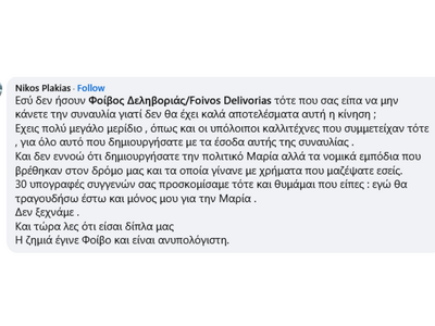 Η ανάρτηση του Νίκου Πλακιά: «Εσύ δεν ήσουν, Φοίβο Δεληβοριάς τότε που σας είπα να μην κάνετε την συναυλία γιατί δεν θα έχει καλά αποτελέσματα αυτή η κίνηση; Έχεις πολύ μεγάλο μερίδιο , όπως και οι υπόλοιποι καλλιτέχνες που συμμετείχαν τότε , για όλο αυτό που δημιουργήσατε με τα έσοδα αυτής της συναυλίας. Και δεν εννοώ ότι δημιουργήσατε την πολιτικό Μαρία αλλά τα νομικά εμπόδια που βρέθηκαν στον δρόμο μας και τα οποία γίνανε με χρήματα που μαζέψατε εσείς. 30 υπογραφές συγγενών σας προσκομίσαμε τότε και θυμάμαι που είπες : εγώ θα τραγουδήσω έστω και μόνος μου για την Μαρία. Δεν ξεχνάμε . Και τώρα λες ότι είσαι δίπλα μας. Η ζημιά έγινε Φοίβο και είναι ανυπολόγιστη».