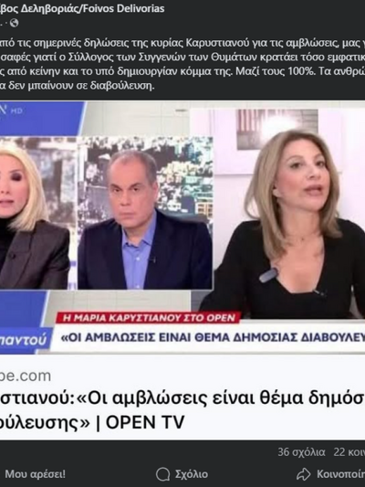 «Μετά και από τις σημερινές δηλώσεις της κυρίας Καρυστιανού για τις αμβλώσεις, μας γίνεται ακόμη πιο σαφές γιατί ο Σύλλογος των Συγγενών των Θυμάτων κρατάει τόσο εμφατικά τις αποστάσεις από κείνην και το υπό δημιουργίαν κόμμα της. Μαζί τους 100%. Τα ανθρώπινα δικαιώματα δεν μπαίνουν σε διαβούλευση».