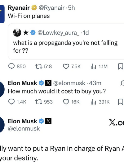 «Πόσο κοστίζει να σε αγοράσω;» ρώτησε ο Μασκ κάτω από μια ανάρτηση της Ryanair στο X. «Θέλω πραγματικά να βάλω έναν Ryan επικεφαλής της Ryanair. Είναι το πεπρωμένο σου», συνέχισε.