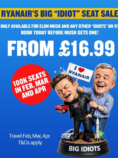 Με μεγάλη δόση δηλητηριώδους χιούμορ, η Ryanair ανακοίνωσε στα κοινωνικά δίκτυα το λανσάρισμα της εμπορικής καμπάνιας με ονομασία «Great Idiots seat sale», δηλαδή «προσφορά θέσεων για τους Μεγάλους Ηλίθιους», την οποία συνόδευσε με ένα σχέδιο, στο οποίο ο Ο’Λίρι χτυπάει το κεφάλι του Μασκ με μια ταμπέλα που γράφει «αγαπώ τη Ryanair».