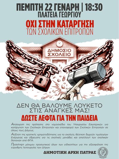 Κάνουμε δική μας υπόθεση τη μόρφωση και την εκπαίδευση των παιδιών μας. Ενισχύουμε τον αγώνα για σχολείο και ζωή χωρίς ταξικούς φραγμούς, αντιστοιχισμένο με τις σημερινές ανάγκες. Απαιτούμε να αποσυρθεί το νομοσχέδιο του ΥΠ.ΕΣ. για την κατάργηση των σχολικών επιτροπών, αναφέρει η σχετική ανακοίνωση του Συλλόγου Δημοκρατικών Γυναικών Πάτρας.