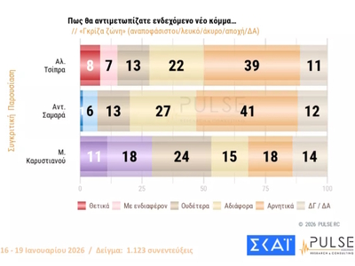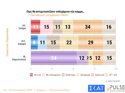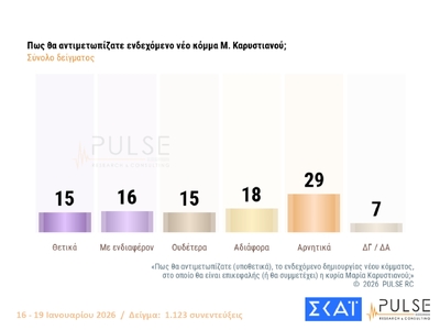 Στο 29,5% η Νέα Δημοκρατία, με το ΠΑΣΟΚ να ακολουθεί στη δεύτερη θέση με 13%, σύμφωνα με τη νέα δημοσκόπηση της εταιρείας Pulse, τα αποτελέσματα της οποίας είδαν το φως της δημοσιότητας το βράδυ της Τετάρτης (21.01.2026). Ιδιαίτερο ενδιαφέρον συγκεντρώνουν οι απαντήσεις των πολιτών για το υπό σχηματισμό κόμμα από τη Μαρία Καρυστιανού.