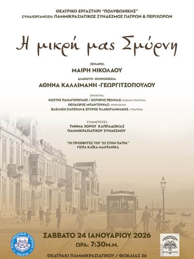 Πραγματοποιείται το Σάββατο 24 Ιανουαρίου, στις 7.30 το απόγευμα, στο Θεατράκι του Παμμικρασιατικού Συνδέσμου Πατρών και περιχώρων (Φωκαίας 26), η θεατρική παράσταση: «Η μικρή μας Σμύρνη», με το ΘΕΑΤΡΙΚΟ ΕΡΓΑΣΤΗΡΙ της « Πολυφωνικής» (Διεύθυνση: Αθηνά Καλλιμάνη- Γεωργιτσοπούλου).