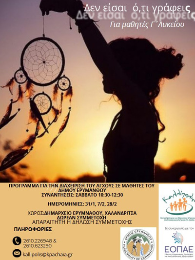 Ο Δήμος Ερυμάνθου και τo Κέντρο Πρόληψης των Εξαρτήσεων και Προαγωγής της Ψυχοκοινωνικής Υγείας Π.Ε. Αχαΐας «Καλλίπολις», το οποίο λειτουργεί σε συνεργασία με τον Εθνικό Οργανισμό Πρόληψης και Αντιμετώπισης Εξαρτήσεων (Ε.Ο.Π.Α.Ε.) και με την υποστήριξη των σχολείων του Δήμου προσκαλούν τους μαθητές Γ΄ Λυκείου να συμμετέχουν στο Πρόγραμμα για τη Διαχείριση του Άγχους, «Δεν είσαι ό,τι γράφεις». Το πρόγραμμα απευθύνεται σε μαθητές που φοιτούν σε σχολεία της περιοχής ή σε όμορα σχολεία, καθώς και σε απόφοιτους που θα λάβουν μέρος στις Πανελλήνιες Εξετάσεις και τη φετινή χρονιά. εργαστήρια και συναντήσεις ανατροφοδότησης στη συνέχεια.