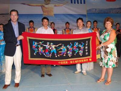 Στα Νικολέϊκα, ο κ. Τριανταφυλλόπουλος, ήταν μάλιστα αυτός που κλήθηκε να βραβεύσει και να επιδώσει αναμνηστικά δώρα στην αντιπροσωπεία της Κίνας - που συμμετείχε στο Φόρουμ - κάνοντας λόγο για"συμφιλίωση λαών και παραδόσεων, που εναρμονίζονται επί σκηνής και μηδενίσουν φυλές, χρώματα και Ηπείρους".Δεν παρέλειψε βέβαια να αναφερθεί στα σημαντικά εμπορικά ανοίγματα της Ελλάδας στην Κίνα τα τελευταία χρόνια, με προϊόντα όπως το ελαιόλαδο, ενώ υπογράμμισε και την επιχειρηματική δράση Κινέζων επιχειρηματιών στην χώρα μας, με έμφαση στο θαλάσσιο εμπόριο και επίκεντρο τον Πειραιά.