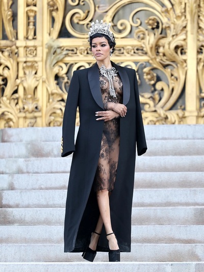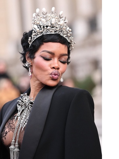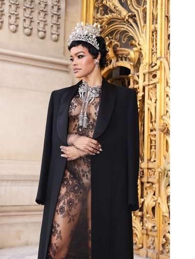 Καλεσμένη στη front row του οίκου Schiaparelli, τρέλανε τα φλας με διάφανη δαντελένια δημιουργία και extravagant κοσμήματα. Φορούσε συγκεκριμένα μεγάλο στέμμα, σκουλαρίκια και καρφίτσα-περιδέραιο γεμάτα αστραφτερά πετράδια και πέρλες, που εμπνεύστηκε ο creative dierector Daniel Rosseberry από τους θησαυρούς που κλάπηκαν πρόσφατα από το Λούβρο! Η Τεγιάνα περπάτησε σαν γεννημένη ντίβα έστω κι αν το nude look της αποκάλυπτε ευθαρσώς όλο της το κορμί.