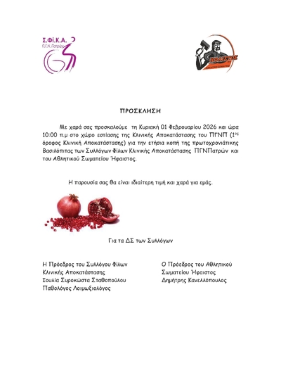 Πρόσκληση για την εκδήλωση κοπής της Πρωτοχρονιάτικης βασιλόπιτας των Συλλόγων Φίλων Κλινικής Αποκατάστασης του ΠΓΝ Πατρών και του Αθλητικού Σωματείου «Ήφαιστος», απευθύνεται στον κόσμο.
