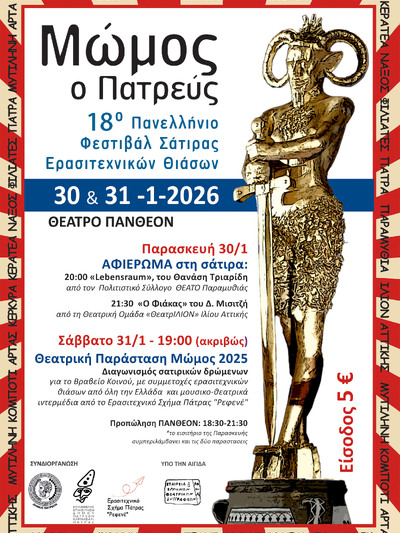 Ο 18ος Μώμος ο Πατρεύς (το Πανελλήνιο Φεστιβάλ Σάτιρας Ερασιτεχνικών Θιάσων) ανοίγει τις πύλες του την Παρασκευή 30/1/2026 στο θέατρο Πάνθεον (Γούναρη και Κανακάρη). Όπως κάθε χρόνο 11 ομάδες από ολόκληρη τη χώρα συνεργάζονται και συνθέτουν ένα διήμερο σατιρικών δρώμενων, στο πλαίσιο του Πατρινού Καρναβαλιού. Τον γέλωτα σκοπεύουν, ιοβόλο και λυτρωτή.