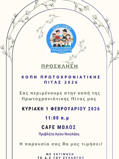 Ο Σύλλογος Ατόμων με Σακχαρώδη Διαβήτη Πάτρας «Ζωή Γλυκιά» προσκαλεί τα μέλη και τους φίλους του στην κοπή της Πρωτοχρονιάτικης πίτας του που θα γίνει αυτή την Κυριακή 1η Φεβρουαρίου 2026 στις 11:00 π.μ στο Cafe Μώλος.