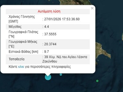 ΝΕΟΤΕΡΟ: Σεισμός 4,7 Ρίχτερ σημειώθηκε το βράδυ της Τρίτης (27/1) ανοιχτά της Ζακύνθου.