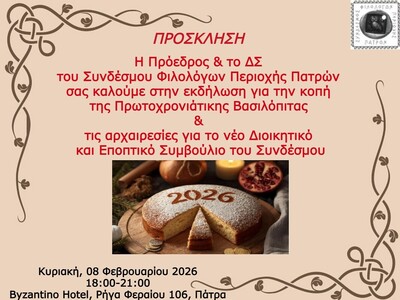 την Κυριακή 8 Φεβρουαρίου 2026, και ώρα 18:30-21:00 στο Byzantino Hotel, οδός Ρήγα Φεραίου 106, Πάτρα.
