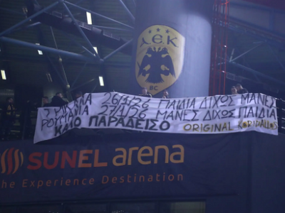 Στο κλειστό της Λεωφόρου οι φίλοι του Παναθηναϊκού τίμησαν τη μνήμη των οπαδών του ΠΑΟΚ, που έχασαν τη ζωή τους στο σοκαριστικό τροχαίο στη Ρουμανία, με ένα πανό που έγραφε «καλό ταξίδι αετοί».