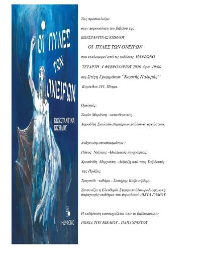 Εκδήλωση παρουσίασης του βιβλίου της Κωνσταντίνας Κιζήλου με τίτλο "Οι Πύλες τωμ Ονείρων" που κυκλοφορεί από τις εκδόσεις Ηδύφωνο, θα πραγματοποιηθεί την Τετάρτη 4 Φεβρουαρίου 2026 και ώρα 19:00 στην Στέγη Γραμμάτων ’’Κωστής Παλαμάς’’ στην οδό Κορίνθου 241 στην Πάτρα.