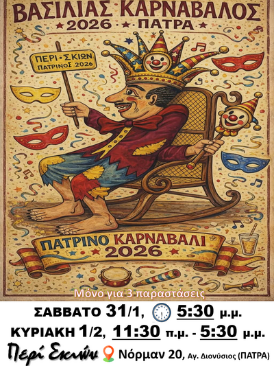 Και αυτό το σαββατοκύριακο 31 Ιανουαρίου και 1η Φεβροαυρίου 2026, ο αγαπημένος μας καραγκιοζοπαίχτης Χρήστος Πατρινός θα μας χαρίσει γέλιο, κέφι και χαρά από το πρώτο μέχρι και το τελευταίο λεπτό της παράστασης που θα παρουσιάσει στο καραγκιοζοθέατρο Περί Σκιών (οδός Νόρμαν 20, Αγ. Διονύσιος, Πάτρα) και στην ξεχωριστή παράσταση «Ο Καραγκιόζης βασιλιάς Καρνάβαλος στο Πατρινό Καρναβάλι 2026» ο Χρήστος Πατρινός.