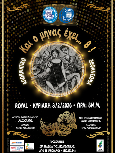 Στις 8 Φεβρουαρίου, στις 8 το βράδυ, στο αποκριάτικα διακοσμημένο θέατρο του πολυχώρου «ROYAL», με τη συνδιοργάνωση της ΚΕΔΗΠ- Καρναβάλι Πάτρας, θα πραγματοποιηθεί το καθιερωμένο αποκριάτικο ξεφάντωμα του Οργανισμού και των φίλων του, με κεντρικό άξονα τα αξέχαστα «αρχοντορεμπέτικα» τραγούδια, αναφέρει με ανακοίνωσή της η Πολυφωνική.