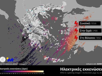 9.316 ηλεκτρικές εκκενώσεις συνόδευσαν τις καταιγίδες που εκδηλώθηκαν κυρίως σε θαλάσσιες, νησιωτικές και παράκτιες περιοχές, σύμφωνα με τις καταγραφές του οργάνου Lightning Imager (LI) του μετεωρολογικού δορυφόρου Meteosat-12. Ως ηλεκτρικές εκκενώσεις ορίζεται το σύνολο αυτών, το οποίο συμπεριλαμβάνει τους κεραυνούς (εκκενώσεις μεταξύ νεφών και εδάφους), τις ηλεκτρικές εκκενώσεις μεταξύ νεφών καθώς και τις ηλεκτρικές εκκενώσεις μεταξύ νεφών και του περιβάλλοντος αέρα. Από το σύνολο των 9.316 εκκενώσεων, οι 1466 καταγράφηκαν πάνω από την ξηρά και οι 7850 επάνω από τη θάλασσα. Στον χάρτη της Εικόνας 2 παρουσιάζονται οι ηλεκτρικές εκκενώσεις που καταγράφηκαν από το όργανο LI έως τις 19:30 της Κυριακής 01/02.