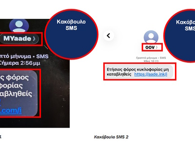 Τα μηνύματα αυτά, με την πρόφαση «μη καταβληθέντος ετήσιου φόρου κυκλοφορίας», ζητούν από τους παραλήπτες να πατήσουν σε σύνδεσμο (link) για να πληρώσουν δήθεν τέλη κυκλοφορίας οχημάτων.