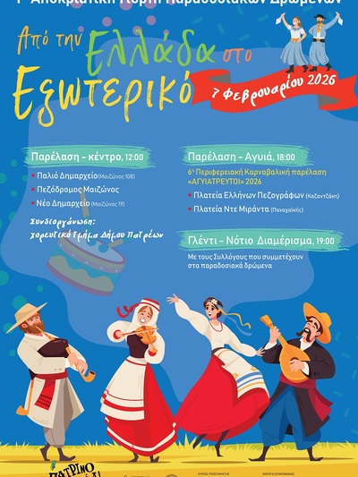 Η ΚΕΔΗΠ – Καρναβάλι Πάτρας φέρνει κοντά τα καρναβάλια της Ελλάδας και του εξωτερικού με την 1η Αποκριάτικη Γιορτή Παραδοσιακών Δρωμένων που θα πραγματοποιηθεί το Σάββατο 7 Φεβρουαρίου 2026, καθ’ όλη τη διάρκεια της ημέρας. Στο πλαίσιο της πρώτης μεγάλης γιορτής, θα συμμετάσχουν 14 παραδοσιακές ομάδες από την Ελλάδα και το εξωτερικό, με αποκριάτικες παρελάσεις και δρώμενα στο κέντρο και σε γειτονιές της πόλης.