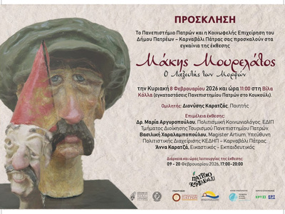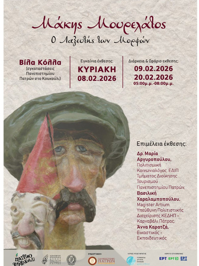-Στη Βίλα Κόλλα, που εδράζεται στις εγκαταστάσεις του Πανεπιστημίου Πατρών στο Κουκούλι, θα φιλοξενηθεί έκθεση με κούκλες κουκλοθεάτρου του Γεράσιμου Μουρελάτου, με διάρκεια από 9 Φεβρουαρίου έως 20 Φεβρουαρίου 2026 και ώρες επίσκεψης 17:00-20:00, ενώ στον αύλειο χώρο θα πραγματοποιηθούν δράσεις της Καρναβαλούπολης. Τα εγκαίνια της έκθεσης «Μάκης Μουρελάτος –Ο Λαξευτής των Μορφών» θα πραγματοποιηθούν την Κυριακή 8 Φεβρουαρίου 2026 , στις 11:00, με ομιλητή τον Ποιητή κ. Διονύση Καρατζά. Αναλυτικές πληροφορίες για την επιμέλεια της έκθεσης μπορείτε να εντοπίσετε στην πρόσκληση: