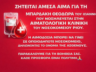 Επείγουσα έκκληση για αίμα απευθύνεται για την Θεοδώρα Μπαρδάκη του Ιωάννη, η οποία νοσηλεύεται στην Αιματολογική Κλινική του Πανεπιστημιακού Νοσοκομείου Ρίου.