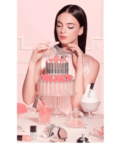 Στην καμπάνια η Ντέβα κάθεται σε ένα τραπέζι που παραπέμπει σε γλυκιές λιχουδές αλλά είναι τα προιόντα της Dior Beauty στις πιατέλες!