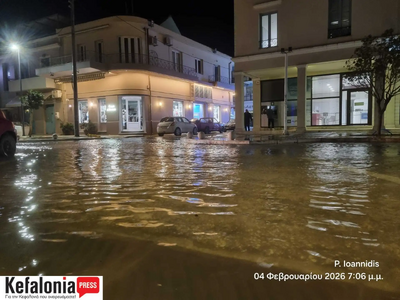 Την ίδια ώρα, ισχυρές βροχοπτώσεις έπληξαν και την Κεφαλονιά, όπου καταγράφηκαν πλημμυρικά φαινόμενα.