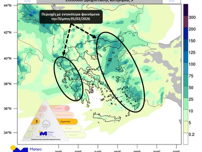 Οι ισχυρές βροχές και καταιγίδες που εκδηλώνονται τις τελευταίες ώρες στη βορειοδυτική χώρα, Πέμπτη (05-02-26) θα επεκταθούν και σε όλη τη δυτική Ελλάδα, τα βορειοανατολικά ηπειρωτικά και την ανατολική νησιωτική χώρα, ενώ πιθανώς θα εκδηλωθούν κατά τόπους και χαλαζοπτώσεις.