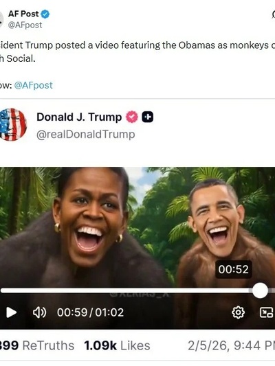 «Ελεεινή συμπεριφορά εκ μέρους του προέδρου. Κάθε ρεπουμπλικανός οφείλει να την καταγγείλει. Τώρα», έγραψε στο X η υπηρεσία Τύπου του Νιούσομ, αναρτώντας το στιγμιότυπο του βίντεο στο οποίο εικονίζονται τα πρόσωπα των συζύγων Ομπάμα πάνω σε σώματα πιθήκων.