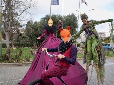 Καλλιτέχνες τσίρκου, ξυλοπόδαροι και ζογκλέρ και η μασκότ του Καρναβαλιού των Μικρών (ο Τζίτζικας) εμψυχωμένη από τη Μαρία Βάρσου των X-Saltibagos έδινε τον αποκριάτικο τόνο στον εξωτερικό χώρο «διαλαλώντας» τη χαρά του Καρναβαλιού μας και φέρνοντας πίσω λαμπερές τις ακτίνες του ηλίου που είχαν προσωρινά σκεπαστεί.
