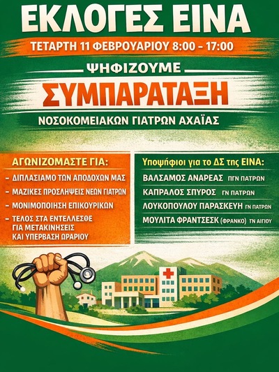 Η σχετική ανακοίνωση αναφέρει: "Μία νέα παράταξη, η ΣΥΜΠΑΡΑΤΑΞΗ ΝΟΣΟΚΟΜΕΙΑΚΩΝ ΓΙΑΤΡΩΝ ΑΧΑΪΑΣ, αλλάζει άρδην το τοπίο στην ΕΙΝΑ (Ένωση Ιατρών Νοσοκομείων Αχαΐας) ενόψει των εκλογών της Τετάρτης 11 Φεβρουαρίου 2026.
