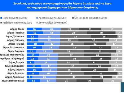 Την πρώτη θέση μοιράζονται οι δήμαρχοι Αλίμου Α. Κονδύλης και Περιστερίου Α. Παχατουρίδης με 51% («πολύ» και «αρκετά ικανοποιημένος»), ενώ την πρώτη τριάδα συμπληρώνει ο Γρ. Κωνσταντέλλος (3Β) με 49%. Στην τέταρτη θέση συναντάμε τον Σ. Δανιηλίδη (Νεάπολης – Συκεών) με 42%, στην πέμπτη τον Π. Σημανδηράκη των Χανίων με 39%, ενώ τρεις δήμαρχοι βρίσκονται στην έκτη θέση (Κ. Βοργιαζίδης-Βέροιας, Γ. Φωστηρόπουλος-Παλαιού Φαλήρου και Θ. Αμπατζόγλου-Αμαρουσίου) με 38%. Την ένατη θέση καταλαμβάνει ο δήμαρχος Ρεθύμνου Γ. Μαρινάκης με 37%, ενώ την δέκατη θέση με 36% μοιράζονται εφτά δήμαρχοι (Αθηναίων: Χ. Δούκας, Θεσσαλονίκης: Στ. Αγγελούδης, Καλλιθέας: Κ. Ασκούνης, Ηρακλείου: Α. Καλοκαιρινός, Κατερίνης: Γ. Ντούμος, Ζωγράφου: Τ. Καφατσάκη και Βολου: Α. Μπέος).