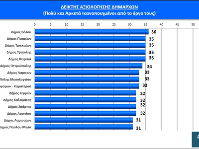 Μετά τους περιφερειάρχες, με την αξιολόγηση των δημάρχων κλείνει η εξαμηνιαία πανελλαδική δημοσκόπηση του aftodioikisi.gr αναφορικά με την εικόνα της Αυτοδιοίκησης στους πολίτες, που διεξήχθη από 5 έως 19 Ιανουαρίου σε δείγμα 6.005 ατόμων. Από τους 60 δημάρχους που αξιολογήθηκαν στην έρευνα οι 19 βρίσκονται κάτω από την (χαμηλή) «βάση» του 29% (σ.σ. μέσος όρος ικανοποίησης των πολιτών από τους δημάρχους), εφτά ακριβώς στο όριο και 34 πάνω από αυτό.