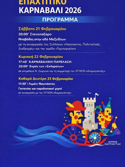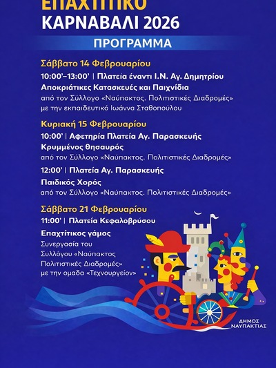 Ο Δήμος Ναυπακτίας και ο Σύλλογος «Ναύπακτος. Πολιτιστικές Διαδρομές» προσκαλούν τον κόσμο στο Επαχτίτικο Καρναβάλι 2026! Με σειρά εκδηλώσεων να πραγματοποιούνται σε διάφορα σημεία της πόλης, οι καρναβαλιστές δίνουν τον εορταστικό τόνο και τον ρυθμό της Αποκριάς στη Ναύπακτο!