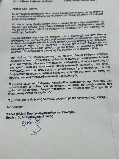 Με την παρούσα επιστολή θα ήθελα να σας ενημερώσω επισήμως για την απόφασή μου να ανεξαρτητοποιηθώ από την Κοινοβουλευτική Ομάδα της Πλεύσης Ελευθερίας με την οποία εξελέγην.