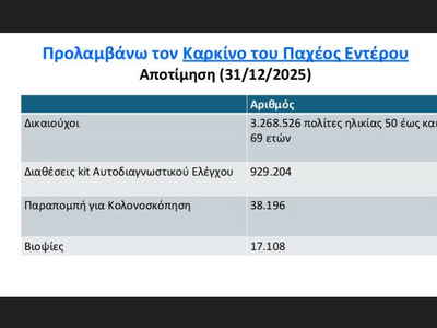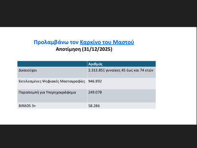 Τα δεδομένα αποτυπώνουν τη συμμετοχή στον προσυμπτωματικό έλεγχο για τον καρκίνο του μαστού, τον καρκίνο του τραχήλου της μήτρας και τον καρκίνο του παχέος εντέρου, καταγράφοντας με σαφήνεια τόσο τον αριθμό των δικαιούχων όσο και εκείνων που προχώρησαν σε αρχικό ή περαιτέρω έλεγχο.