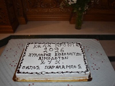 Ο Σύλλογος Εθελοντών Αιμοδοτών Κέντρου Υγείας Χαλανδρίτσας τίμησε τον Προστάτη του "Άγιο Χαράλαμπο" στον ΙΝ Αναλήψεως Ψαροφαίου Πατρών, όπου τελέστηκε θεία λειτουργία μετά αρτοκλασίας υπέρ υγείας των μελών του Συλλόγου μας και ακολούθησε η κοπή της πρωτοχρονιάτικης πίτας, μέσα σε κλίμα εγκάρδιο και εορταστικό με ανταλλαγή ευχών.